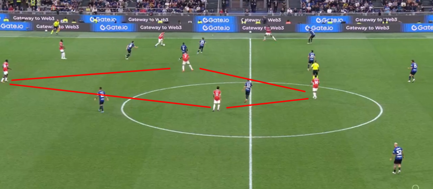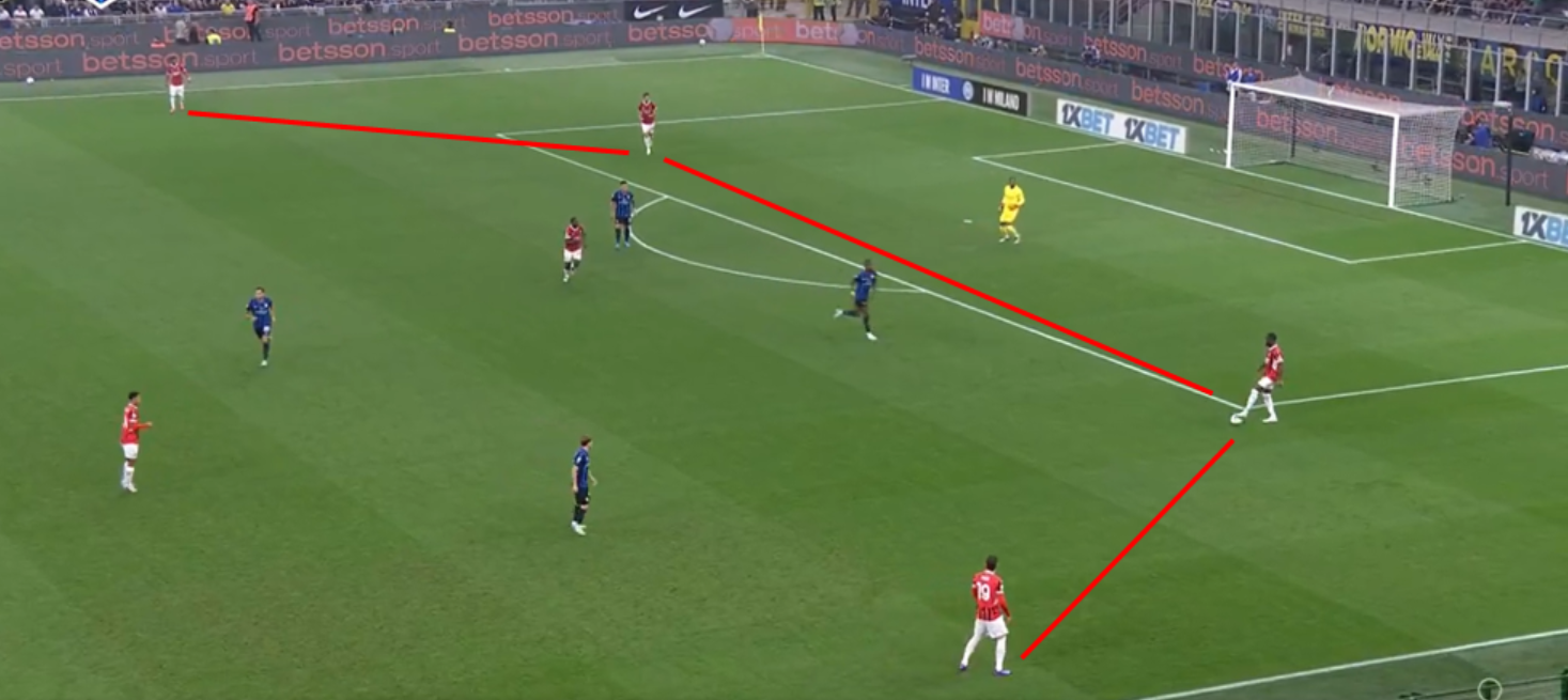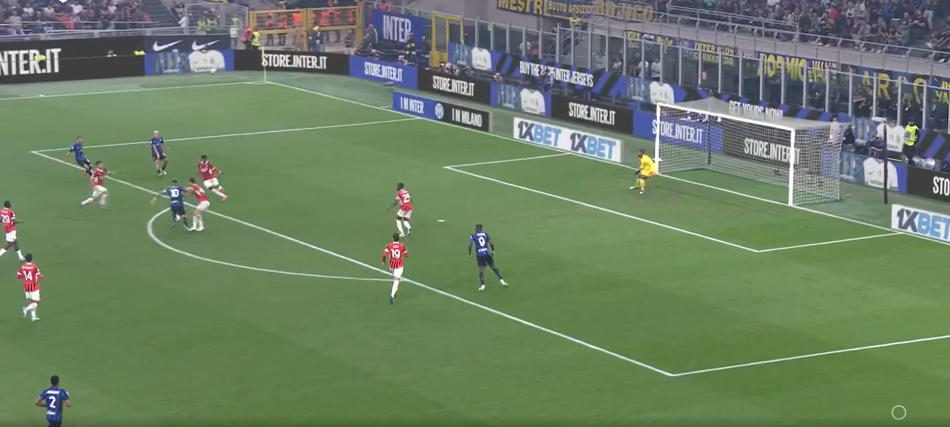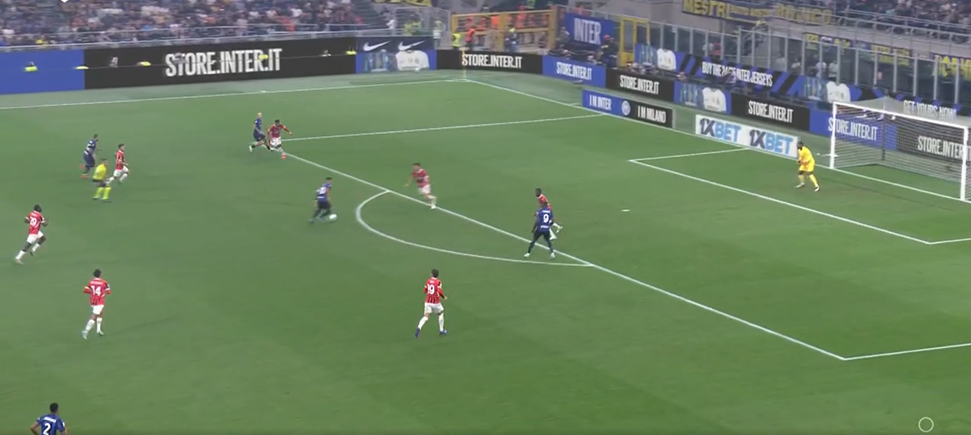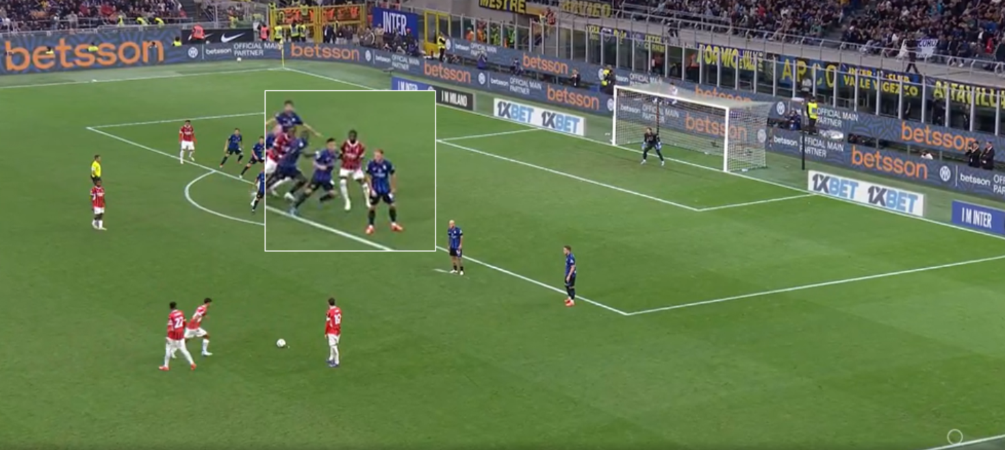 In fase difensiva invece abbiamo visto un Milan molto corto (circa 20 metri) col suo classico 424. Pressava su rimessa dal fondo, ma in linea di massima ha sempre tenuto una linea di pressione abbastanza bassa, consentendo all’Inter di palleggiare con i difensori, ma senza trovare sbocchi tra le linee. A differenza del Milan di Pioli che andava più a uomo, con Fonseca si è lavorato a zona e questo ha cambiato parecchio il risultato finale. Proprio per una questione di caratteristiche, una squadra che fa un calcio relazionale con tanta fluidità (e l’Inter è una delle migliori interpreti in questo), è difficile da limitare per chi va uomo su uomo. L’Atalanta è l’esempio pratico di come negli ultimi anni abbia sofferto tantissimo contro l’Inter, proprio perché lavora uomo-uomo a tutto campo e contro un calcio relazionale con uno sviluppo fluido e ben allenato, chi va a uomo soffre oltremodo. Il Milan di Pioli aveva principi un po’ diversi, ma sempre andava a uomo creando coppie a centrocampo. Con Fonseca cambia il modo di difendere e questo ha lasciato spazi (volontariamente) all’Inter solo sulle fasce, proteggendo il centro e senza mai andare a pressarli.