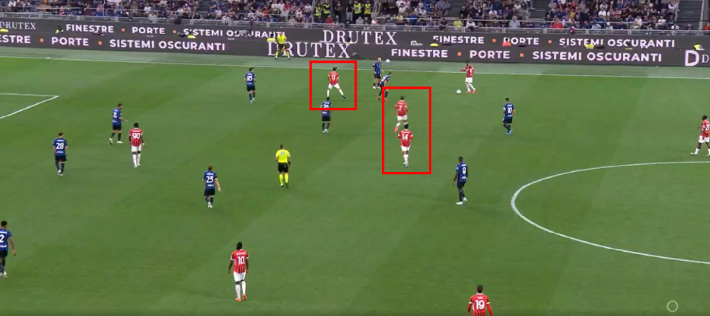 Come dicevamo in precedenza, rispetto a inizio campionato, stiamo vedendo ultimamente il Milan costruire con i 4 difensori e abbassando Fofana da mediano, mentre a inizio anno stavamo vedendo spesso una costruzione 3+2. La crescita di condizione di Fofana abbinata alle sue qualità elevatissime di interdizione, fanno aumentare nettamente la solidità del Milan, anche se Fofana non è solo un interditore, ma è un centrocampista totale come avevamo visto nell’analisi quando è stato acquistato. Ha qualità per toccare la palla di prima, per non perderla sotto pressione e farla progredire in verticale.