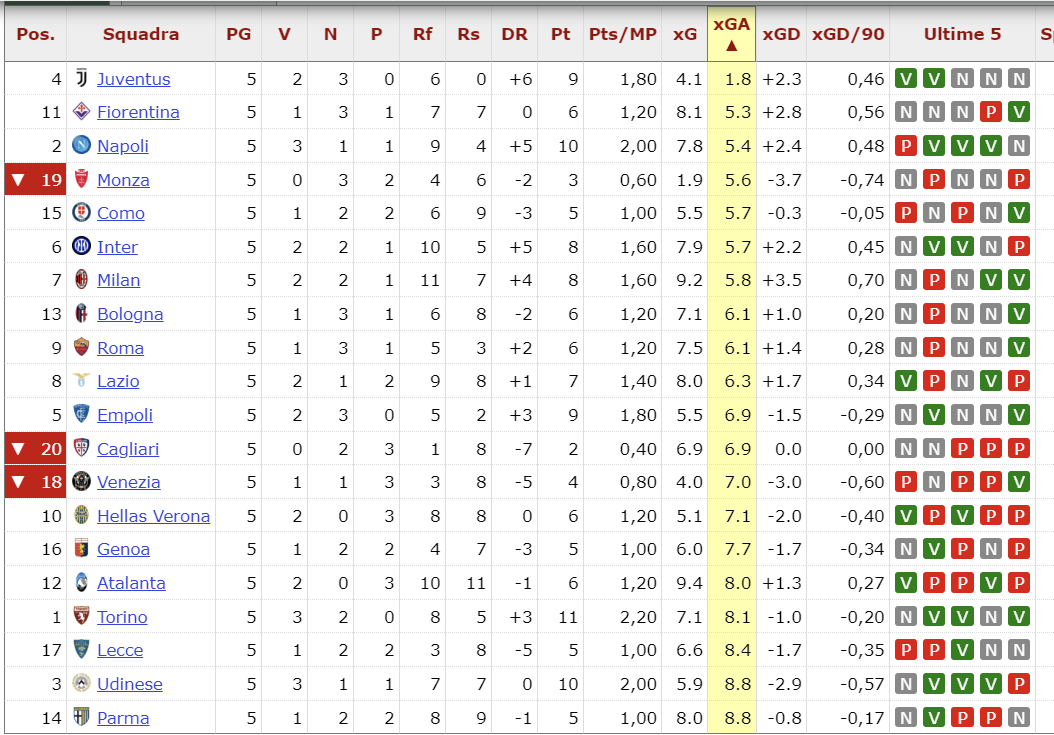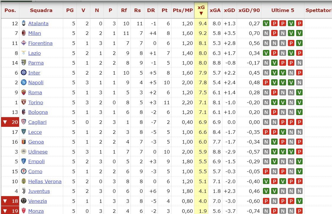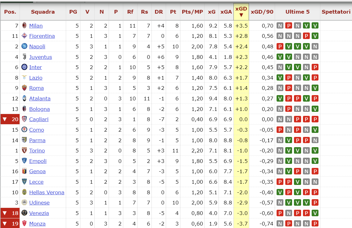 Il Milan non è certamente partito benissimo, ha avuto varie problematiche tattiche, il campione di gare è ancora ristretto, però dopo 5 partite possiamo dire che il Milan è la squadra che ha creato di più insieme all’Atalanta con 9,4 e 9,2 sono già 1 xG oltre la terza come produzione il che significa che offensivamente le cose stanno andando molto bene rispetto ad esempio ad una Juventus terzultima per produzione. Come xG concessi è in linea con le altre, esclusa la Juventus che sta facendo un campionato a parte in quello. Non si direbbe, ma nei fatti la fase difensiva del Milan ha concesso lo stesso di Inter e Napoli. E guardando la differenza tra quello prodotto e quello concesso, il Milan è nettamente primo. Questo fa capire ancora una volta che la squadra è molto forte in Serie A, può e deve giocarsela per la vittoria. E che il lavoro di Fonseca sta procedendo tutto sommato abbastanza bene anche se c’è ancora tanto lavoro da fare per sistemare dei meccanismi. Ma non ho mai visto squadre perfette dopo 1 mese con allenatore nuovo. Il tempo, piaccia o no, serve a chiunque. Quindi testa bassa, continuare a lavorare ma con positività.