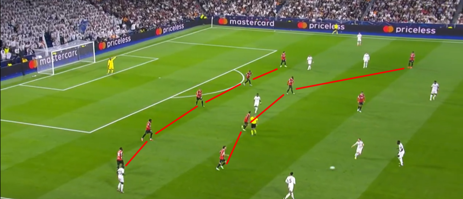 Concludo con l’azione che porta all’angolo che crea il vantaggio. In estate parlavamo del perché il Milan avesse cercato punte associative come Morata e non attaccanti d’area. Nel progetto tattico ben chiaro, Fonseca voleva una punta che legasse il gioco per poi anche occupare l’area perché il Milan ha esterni forti e centrocampisti bravi a inserirsi. Morata è un giocatore intelligentissimo, probabilmente la punta più intelligente tatticamente passata in Serie A negli ultimi anni. In questa azione vede lo spazio, si abbassa e offre una linea ulteriore di passaggio. Il Real Madrid ha difficoltà nel capire e andare a prenderlo.