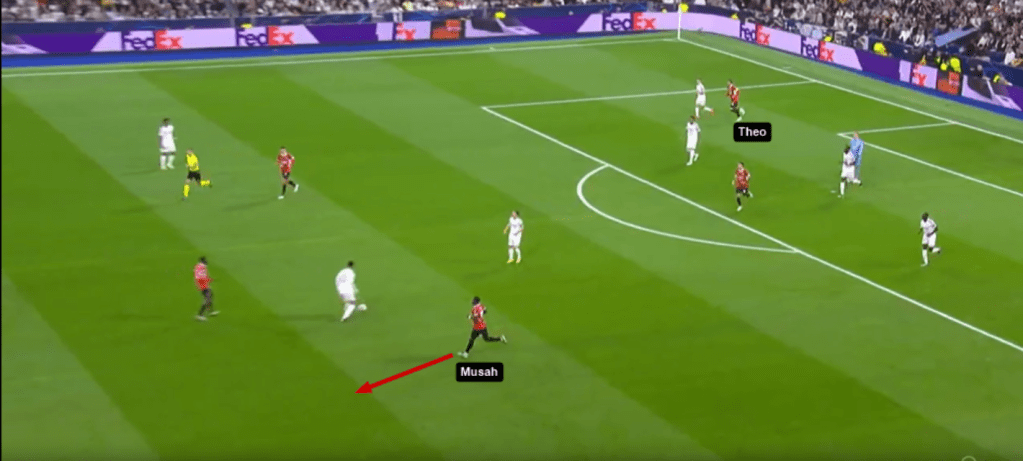 Theo fa una cavalcata in fascia, arriva al cross che viene bloccato da Lunin. Musah aveva accompagnato l’azione e si vede come immediatamente si “mangi” il campo e rientri. Cosa che per caratteristiche non può certamente fare un esterno offensivo (avevamo visto già nei mesi scorsi questa problematica).