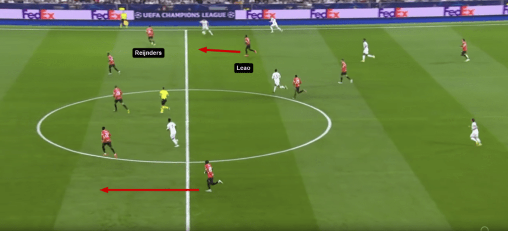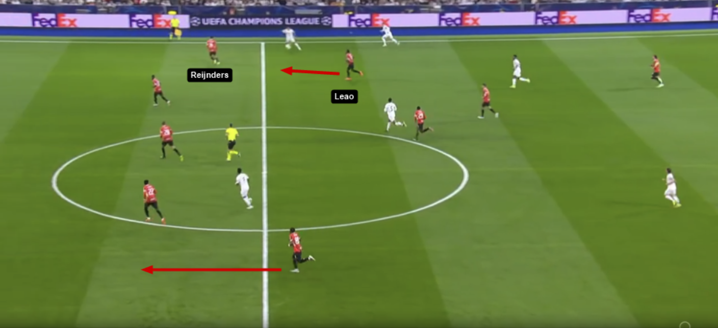Nel continuo dell’azione, si nota come il Milan stia lavorando in modo ottimo per assorbire le transizioni. Era stato un problema a inizio anno, ora si nota come col lavoro abbiano sistemato questa problematica. Qua Musah abbiamo visto che recupera rapido e vediamo l’intelligenza di Reijnders e anche il sacrificio di Leao. Reijnders legge il buco lasciato da Theo e lo occupa lui. Il Milan sta subendo una transizione ma è tatticamente equilibratissimo, non ha 2 uomini come successo in Parma-Milan.