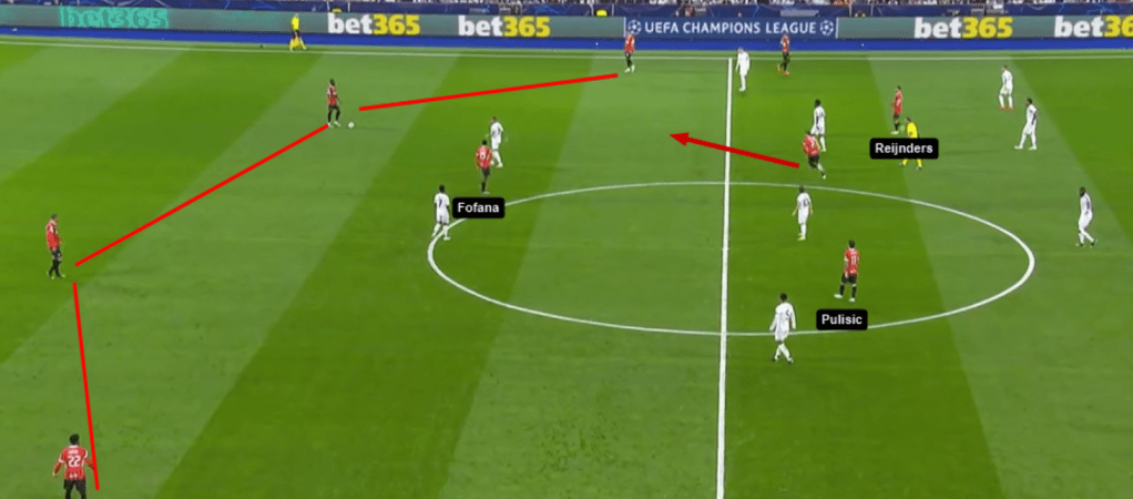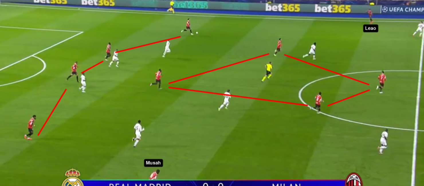 In fase di possesso invece Musah saliva tantissimo dando ampiezza a destra. Il suo lavoro è stato pazzesco. In fase difensiva ha lavorato in modo eccellente con Emerson su Vinicius, in fase offensiva dava spesso l’ampiezza, ma lo abbiamo visto anche prendere corridoi centrali scambiando posizione con Pulisic ad esempio e per finire anche a volte invertirsi con Emerson che spingeva dando l’ampiezza con Musah che agiva da “terzino”. In definitiva una duttilità pazzesca che fa capire anche quanto sia un giocatore con ottime letture delle situazioni e come Fonseca stia riuscendo a insegnare ciò che vuole ai ragazzi. Ma oltre a questo garantisce quell’equilibrio proprio per le caratteristiche che ha. Vediamo ad esempio in questa azione.