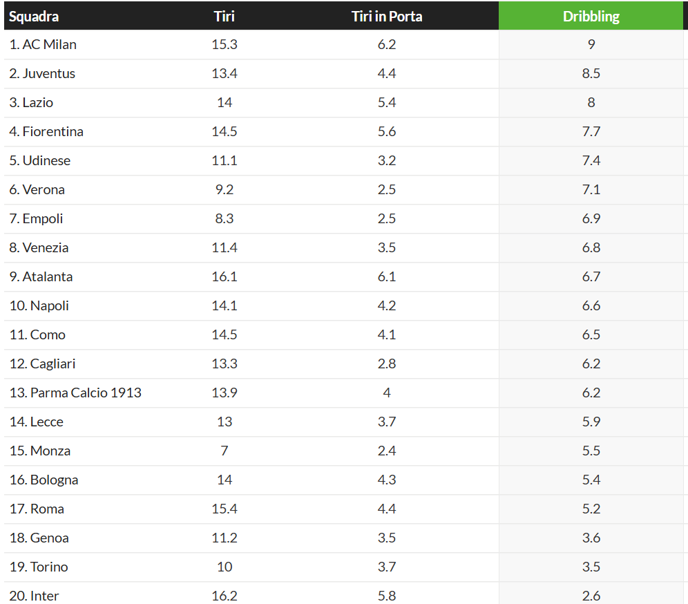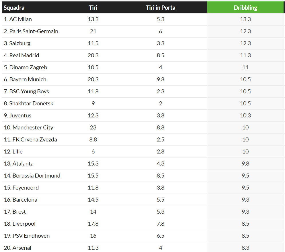 Il Milan è la squadra che dribbla di più sia a livello di Serie A, sia a livello dell’intera Champions League. Inter (tanto vi interessa il paragone) è ultima in A e 32ma in Champions. Da notare bene, il Milan ha questi dati in Champions pur avendo affrontato in 3 gare su 4 Liverpool, Leverkusen e Real Madrid, di cui 2 su 3 fuori casa. Questa caratteristica non è di per sé fondamentale per vincere le partite, ma capite anche che è un’arma molto potente quando si riesce a dare un ordine di gioco e principi ben chiari. Una squadra come l’Inter sarà sempre vincolata a muovere palla all’interno del proprio spartito tattico correndo molto più dell’avversario, non ha altro modo per risalire il campo. Non ha nessuno in grado di saltare l’uomo e creare una superiorità. Il Milan a differenza dell’Inter ha giocatori in grado di saltare costantemente l’uomo e creare pericoli anche con giocate dei singoli. Se si riesce a dare dei principi di gioco solidi, uniti alle grandi qualità tecniche e atletiche dei ragazzi, capite automaticamente che si ha in mano un potenziale esplosivo. Poi è anche normale che un allenatore che eredita una squadra che viene da 5 anni andando a uomo e dà un’impostazione diversa lavorando di reparto, abbia necessità di tempo per far assimilare totalmente alcuni concetti.