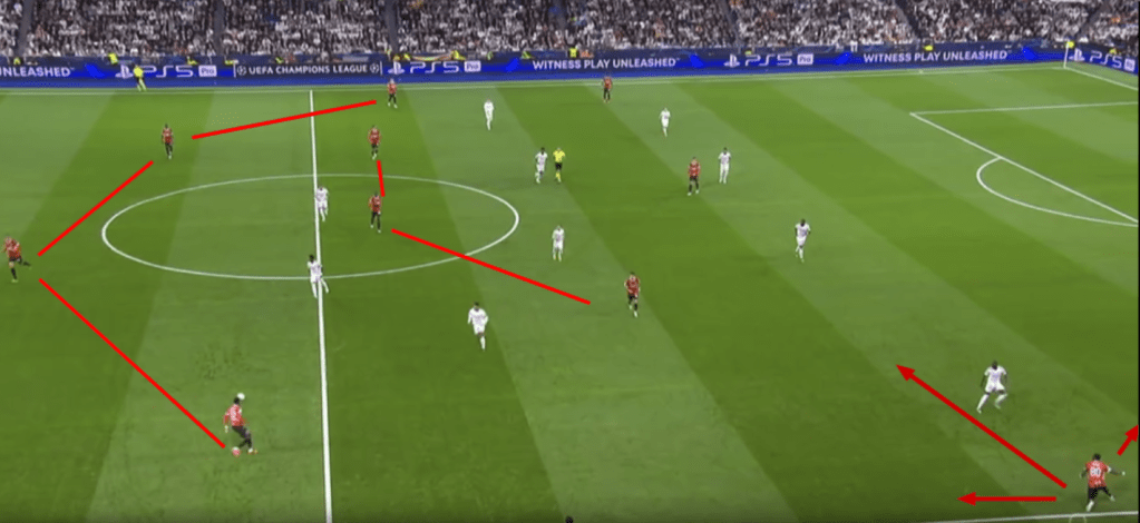 Nelle ultime settimane si era già vista una netta crescita sotto il profilo delle idee, dei principi di gioco. Col Napoli è stata fatta una grande gara, persa soprattutto per la mancanza contemporanea di tutti gli elementi più qualitativi e un errore di Maignan che ha chiuso la gara. Vedere quel tipo di prestazione era già sintomo che la squadra sta lavorando sempre meglio sui principi di gioco. Anche col Monza si è visto un Milan con un problema tattico della partita in sé nel primo tempo, ma non confondiamo una situazione tattica temporanea con il recepire i principi di gioco. Col Monza si è fatto un brutto primo tempo per un problema tattico risolto poi nel secondo tempo, ma anche in quella gara si è compreso come il Milan sia una squadra in crescita esponenziale. In questo campionato contro il Monza nessuna squadra ha creato più di 2 xG. Inter 1,7 pareggiando o Atalanta 1,2 per fare due esempi. Il Milan ha creato 2,5 che è una quantità importantissima in una gara contro un’avversaria che non concede mai così tanto. Questo fa capire quanto la squadra sia forte qualitativamente. Prima di passare a vedere alcune situazioni della gara col Real Madrid vorrei riportare anche questo dato.