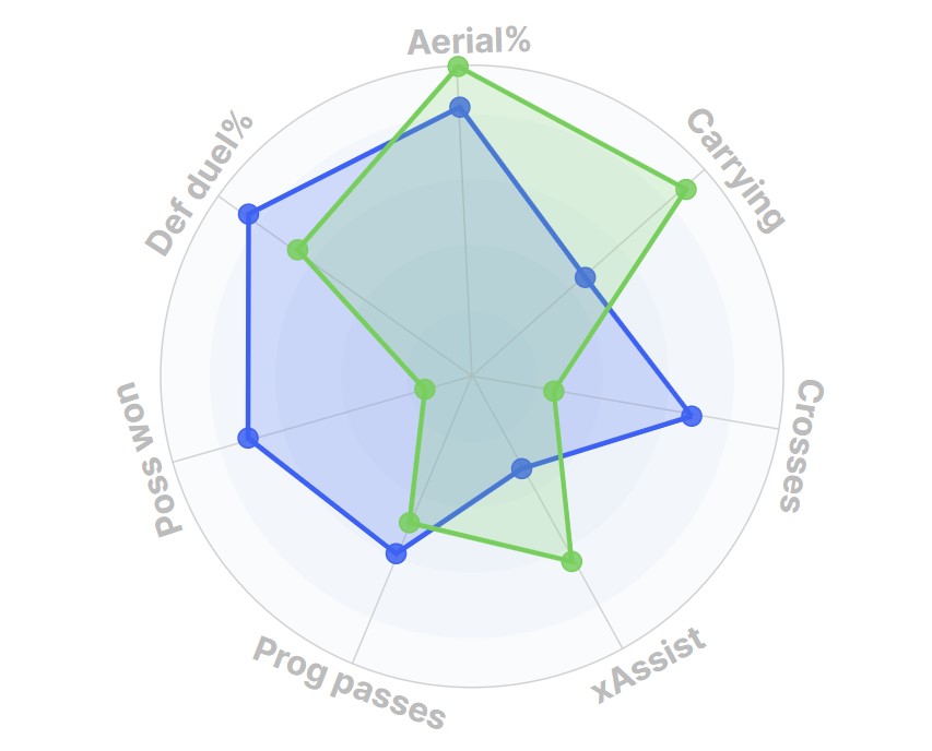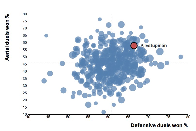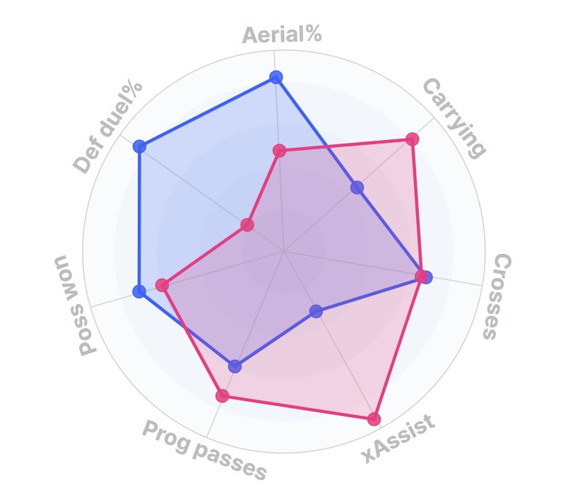 Come si nota in questo grafico, risulta tra i migliori in questa stagione combinando duelli difensivi e duelli aerei, il che ci fa capire che comunque ha imparato a gestire bene gli 1vs1 e che anche nel gioco aereo è sopra la media per il ruolo e la cosa sorprende essendo solo 175 cm. Le gambe potenti che lo rendono un giocatore velocissimo, gli permettono di staccare bene da terra compensando quei cm che mancano, anche se Theo avendo una struttura migliore gli era superiore in questo.