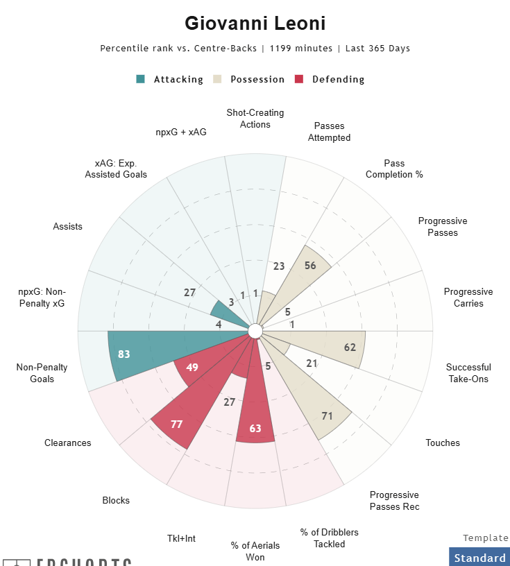 Nel vedere i dati bisogna sempre tenere conto del contesto. Avere numeri più alti ad esempio nei dati di possesso in una squadra dominante è molto più semplice che in una squadra da salvezza. Sicuramente a primo impatto si vede come sia un giocatore forte nel gioco aereo mettendosi nell’86mo percentile, un dato molto importante. E si vede come questo gli abbia permesso di trovare anche la via della rete molto più degli altri dc, risultando addirittura nel 97mo percentile. Quindi abbiamo visto che è forte, anzi dominante, nel gioco aereo e ha il vizio del gol sui piazzati, ma che tipo di difensore è?