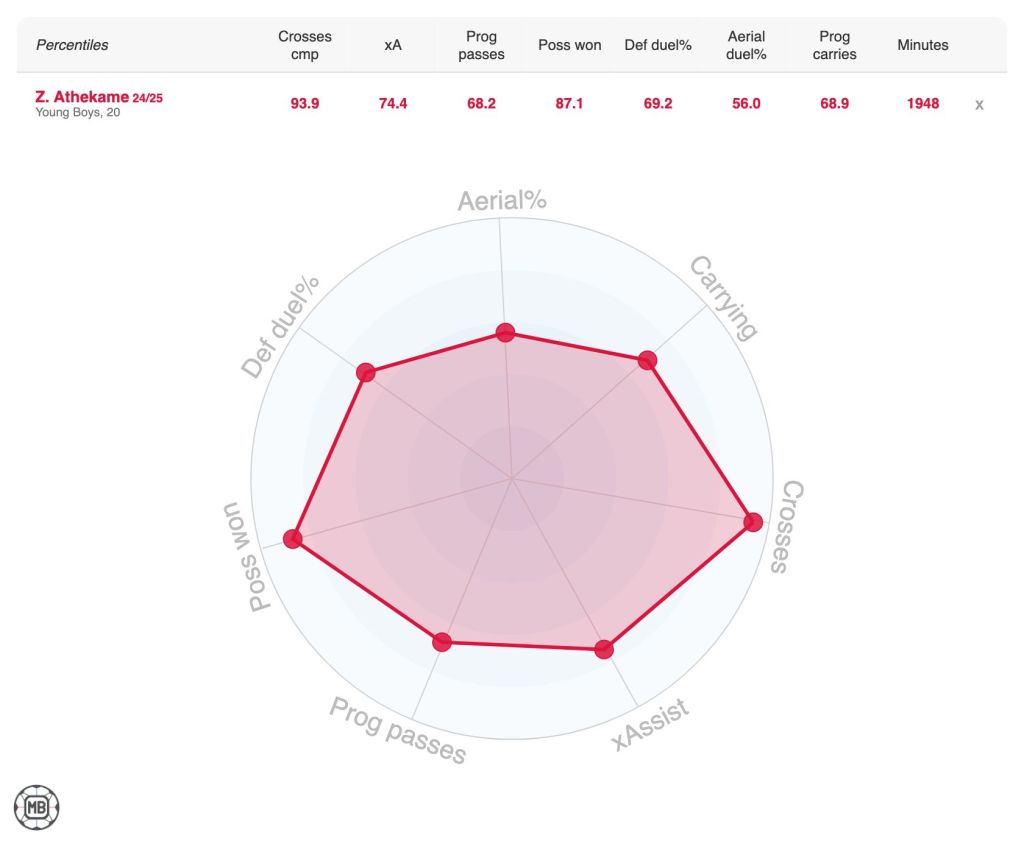 Zachary Athekame è un’operazione ormai chiusa da parte del Milan su una base intorno ai 10 milioni bonus inclusi e il 10% su futura rivendita. E’ un giocatore giovane, classe 2004, per essere precisi dicembre 2004 quindi quasi 2005, ventenne in rampa di lancio che arriva al Milan ovviamente per completare uno slot, non per fare il titolare. Semplicemente si inserisce in rosa un giovane con caratteristiche interessanti ad un prezzo abbordabile e si lavorerà per farlo crescere e magari avere un buon terzino nei prossimi anni. Vediamo al solito una panoramica di dati sul ragazzo in modo da avere un quadro che possa aiutare nella comprensione di quelli che sono i suoi punti forti e deboli e cosa ha spinto il Milan a investire su di lui.