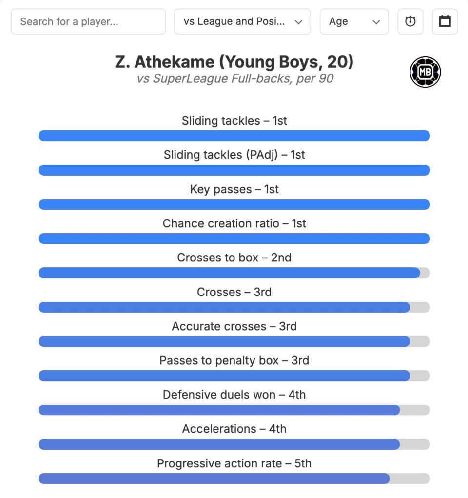 Partiamo dalla fase difensiva. Athekame è un giocatore con grande gamba, buona struttura fisica, 180 cm ma muscolarmente forte. In 1vs1 difensivo è difficile da superare, tiene molto bene sia sul breve che sul lungo. A livello di tackle e duelli difensivi è tra i migliori giocatori del campionato svizzero, mentre guardandolo giocare si nota come abbia ancora da crescere a livello di posizionamento e letture. E’ un profilo più di spinta che difensivo. Forte quando puntato, ma meno forte nel capire le situazioni e posizionarsi nel modo corretto. Potrebbe essere più facile per lui inserirsi da quinto a tutta fascia protetto dal braccetto, più che da terzino a 4 che necessita avere più letture e lavoro di reparto.